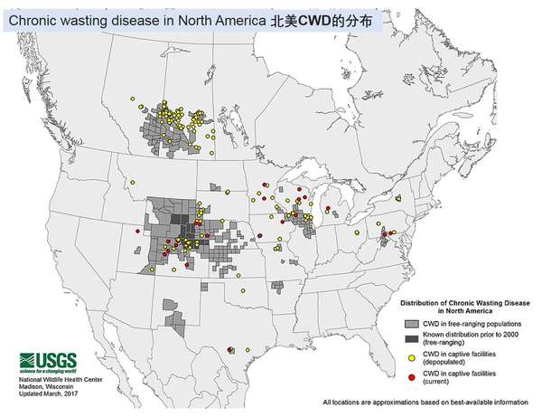今朝 CWD 本家儿要在美国和加拿大的两个省份分布,此外 2016 年在欧洲挪威也呈现了 CWD 的报道。我们的近邻韩国,也呈现过输入性的 CWD 病例——
