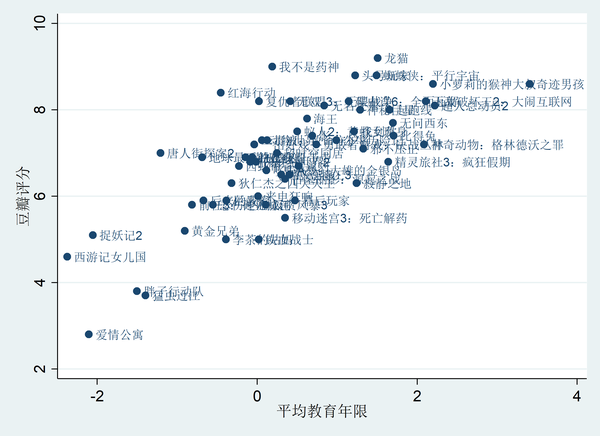上图是豆瓣评分和片子倾标的目的不雅众的教育年限之间的关系。可以看到,越倾标的目的于高教育地域的片子,在豆瓣上都有越高的评分。