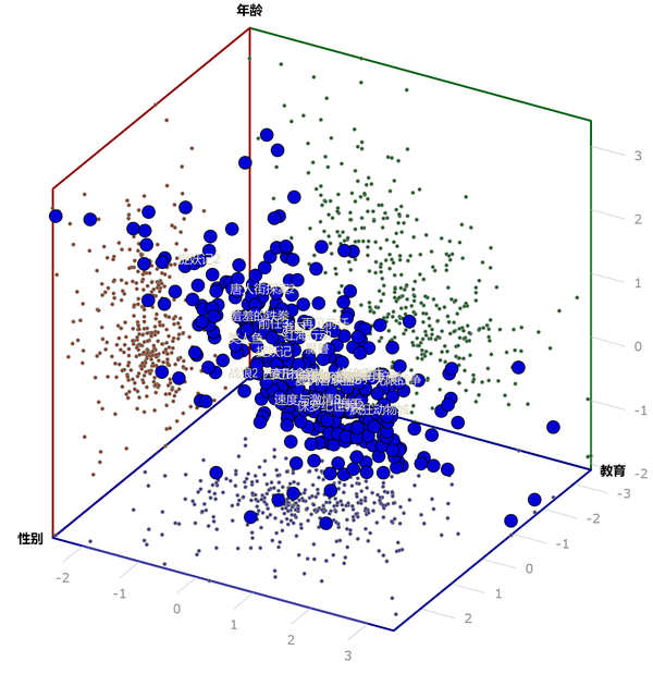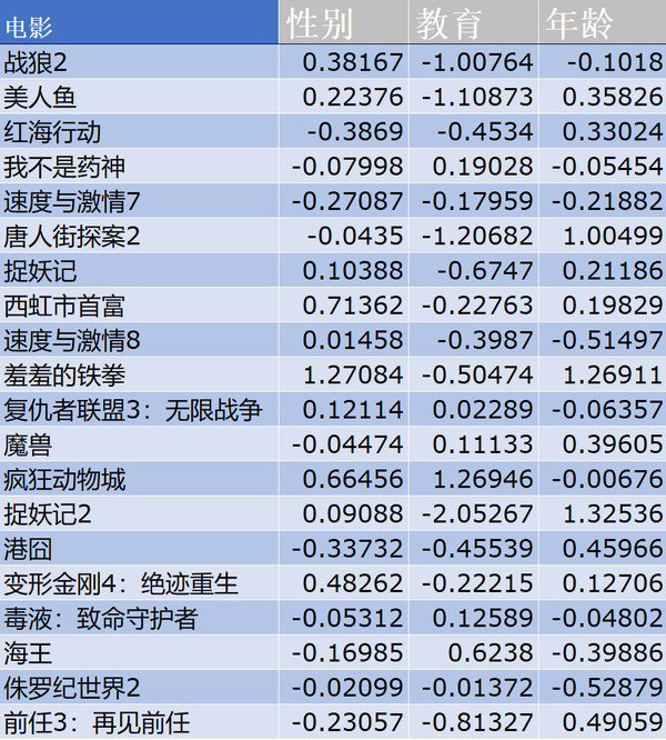 在上面的三维坐标中,大于零的部门暗示性别越偏男性 / 教育越高 / 春秋越小 越偏好于这部片子。用不雅影人次排名前 20 的片子举例,具体表格如下:
