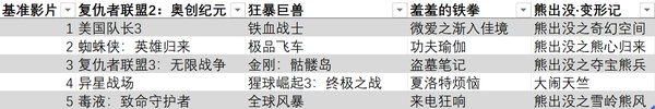 可以看到,在空间上最接近的几个影片有不异的不雅众偏好,一般也处在统一个范围内。好比到《复仇者联盟 2》距离比来的 5 部片子,有 4 部是漫威出品;在距离《熊出没·变形记》比来的 5 部片子中,有 4 部都是熊出没的系列片。
