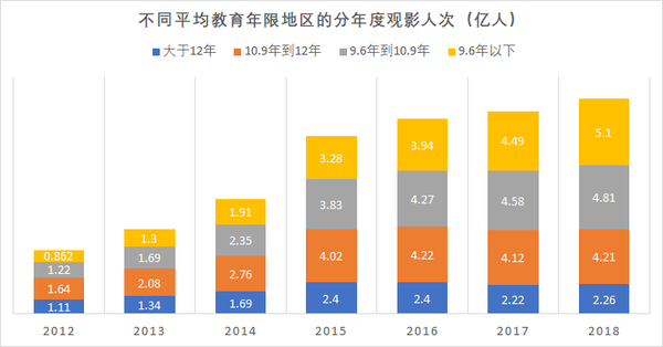 而平均教育年限在 9.6 年以下的地域,从 2015 到 2018 年的不雅影人次上升了 55%。