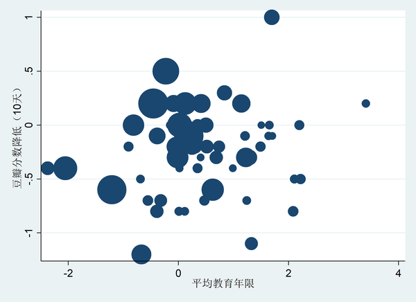上图是豆瓣开分和十天后的评分差额与片子倾标的目的不雅众的教育年限之间的关系。散点图的相关性在 1%的程度上显著,申明片子的方针不雅世人群越倾标的目的于低教育生齿,豆瓣给他的评分下降就越多。