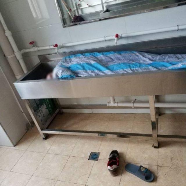 这是一张来自于早上 7 点多的照片。那时晚上这哥们晚上就断片了,然后我们就给他把衣服脱了让他睡觉,可能他三更起来上茅厕感觉裆下生风,于是本身裹上被子去上茅厕,后来,我们发现他的时辰就是这样了,谁也不知道他是怎么翻上水槽的,这应该一向是个谜了吧。再弥补一点,这哥们睡下铺的(我们黉舍上下铺的那种)。