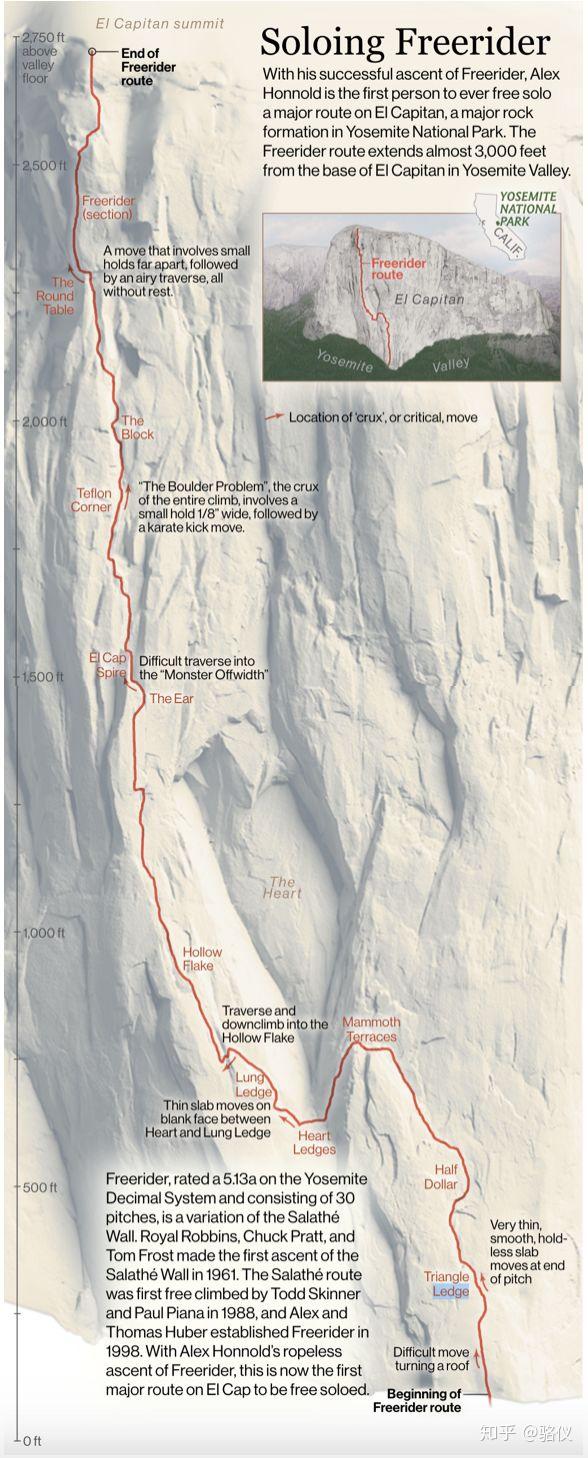 Freerider(搭便车之路)是攀缘酋长岩的经典路线,全长 3000 英尺(约 914 米),共 33 段。