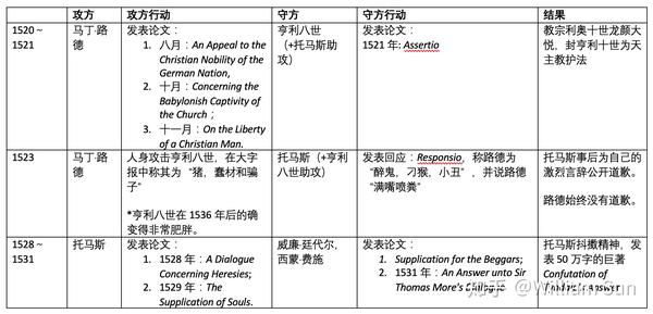 他的乐趣很快就有了用武之地。《乌托邦》面宿世仅一年后,马丁·路德的《95 条论纲》便在欧陆拉开了波澜壮阔的宗教鼎新的序幕。托马斯天然也没闲着:他隔着海峡和马丁·路德睁开了激烈的骂战。战况极为激烈,有来有往,不时有粗鄙之语。大致脉络如下附表格所示: