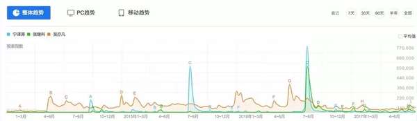 ▲宁泽涛(蓝色),张继科(绿色),吴亦凡(橙色)。百度指数按照计较用户搜刮相关信息的点击量,描述相关信息的趋向转变。