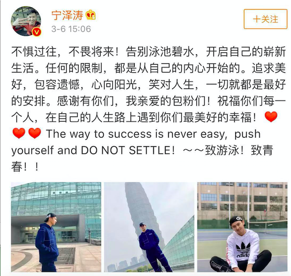 海说神聊京时候 3 月 6 日,泅水活动员宁泽涛鄙人午 3 点 06 分,发微博暗示本身将辞别泳池,起头新糊口。今天也是他 26 岁生日。