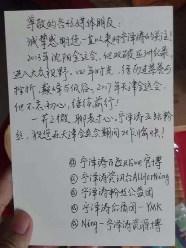 天津奥体中间泅水馆内,身着红色阿迪达斯的姑娘们忙着把装有亲笔信和小礼品的袋子送到媒体记者手里。此次的天津全运会,宁泽涛的粉丝们筹议好了步履的步伐——本家儿动接近媒体。