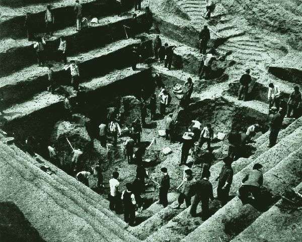 始皇初即位,穿治骊山。及并全国,全国徒送传诣七十余万人,穿三皋,下铜而致椁,宫不雅百官奇器珍怪徙臧满之。令匠作机弩矢,有所穿近者辄射之——司马迁《史记·秦始皇本纪》
