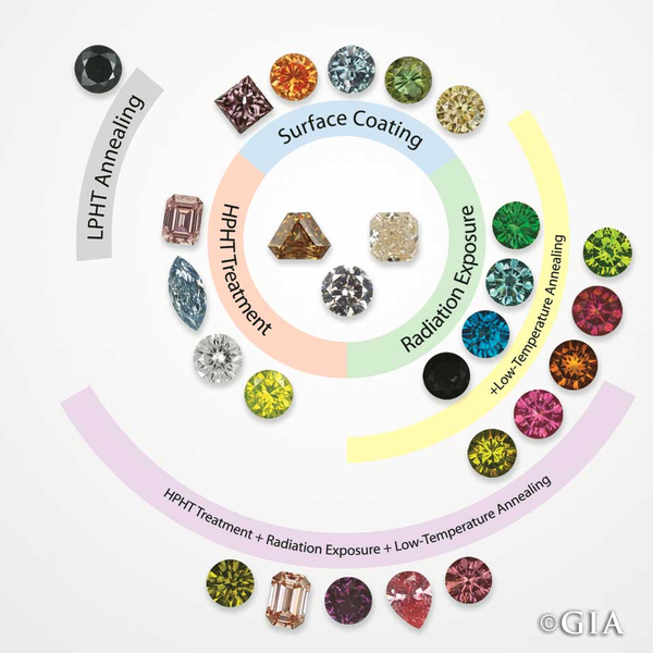 例如,无色钻石经辐照后形当作色心,可带有黄色或绿色等颜色。