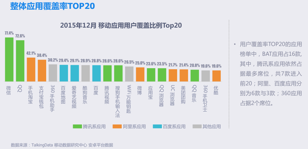 BAT 的触手已经从互联网延长到移动互联网的良多范畴,PC 时代的 BAT 在移动互联网时代仍然是强势的么?谜底是必定的,如下图,可以看到在用户笼盖率 TOP20 的应用榜单中,来自 BAT 的应用占到了 16 条目。而现阶段的一个创业者最后面对的环境,很有可能是以下几种之一,那就是被 BAT 封杀、被 BAT 投资、被 BAT 收购或者敌手酿成了 BAT。