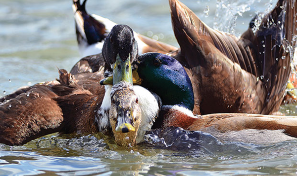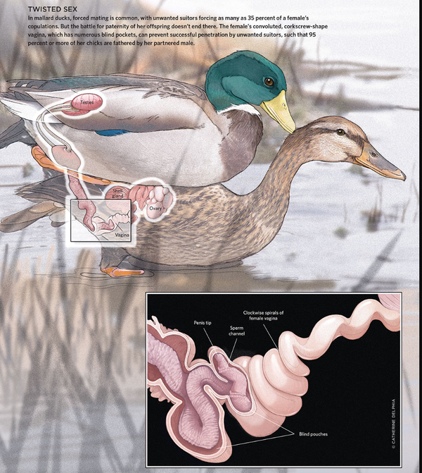 这个是上面提到的飞蛾和兰花的例子有异曲同工的处所,但纷歧样的是这个趋同进化发生在统一个物种的雌性和雄性上。雄性鸭子为了可以“处处留种”,让本身的精子有更多机遇可以或许在交配期到分歧的雌性中,有 35%的交配是雄性霸王硬上弓让雌性屈就的(下图)。但对于雌性来说,它加倍但愿可以或许和它承认的雄性交配,因为这样可以或许让本身的基因更好地传递下去。