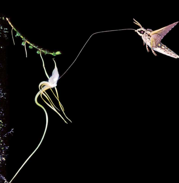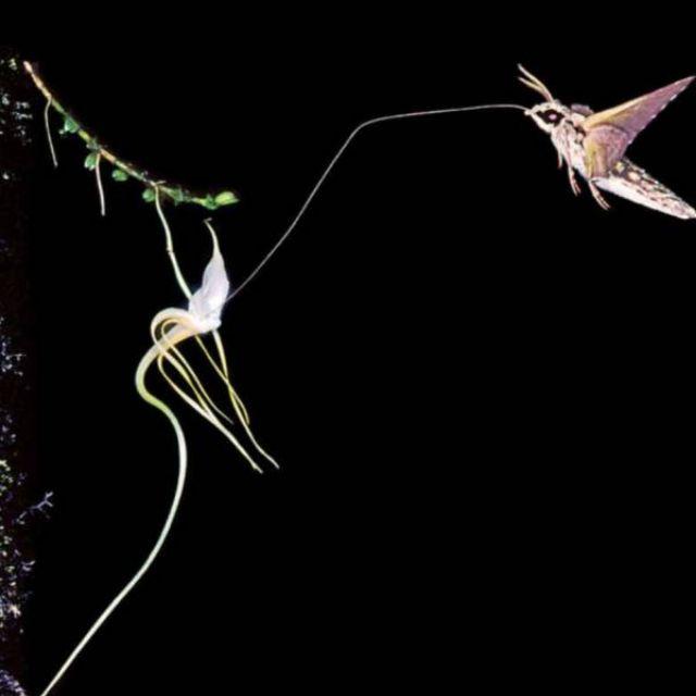 兰花酝酿了甜美的花蜜目标是让飞蛾在采食的时辰帮忙自身传粉,原本飞蛾采蜜,帮手传粉互惠互利,但有的飞蛾却不肯意慢慢“进化”出了长长的舌头,这样就可以既采花蜜又不消粘上花粉了。没法子兰花让本身的花蜜藏得越来越深,而飞蛾也“进化”出越来越长的舌头。最终酿成了一下这幅气象。