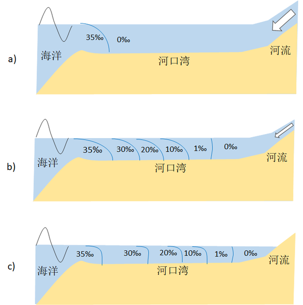 河口湾盐度夹杂状况分为三种:a)高度分层型,b)部门夹杂类型,c)充实夹杂型,别离对应下图 a) b) c)。这三种类型本家儿如果因为山潮比(即径流 / 潮汐的比值)分歧导致的,当径流相对于潮汐比力强,河口地域表示的特征是高度分层的,即 a);当径流相对于潮汐比力弱,河口地域表示的特征是充实夹杂的,即 c)。