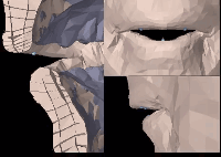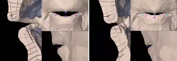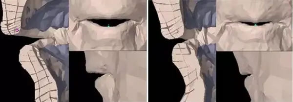 发出 w 的音节时唇与牙接近距离参照点(蓝色点)左侧是覆合 / 笼盖牙布局,右侧是对切咬合布局