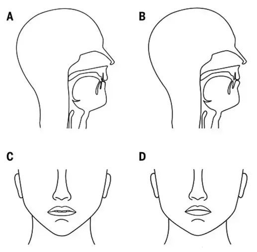唇齿音 f(左)和双唇音 m(右)两种模式中切牙(门牙)和嘴唇的位置。