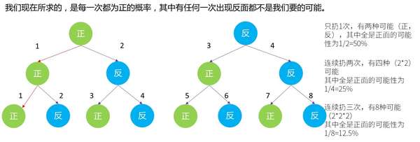 第三次扔,已经有了 2 的 3 次方也就是 8 种,别离为(正,正,正)(正,正,反)(正,反,正)(正,反,反)(反,正,正)(反,正,反)(反,反,正)(反,反,反),可以看到,持续三次为正的环境,在 8 种中只有 1 种,可能性是 1/8=12.5%