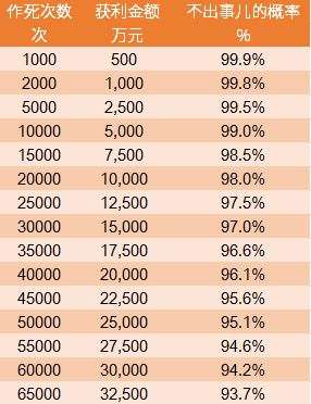 那么玩 1000 次都不出事儿的概率是几多呢?99.9999%的 1000 次方,简单用计较器算一下,就可以得出下面这张作死的收益与对应出事儿概率的统计表。