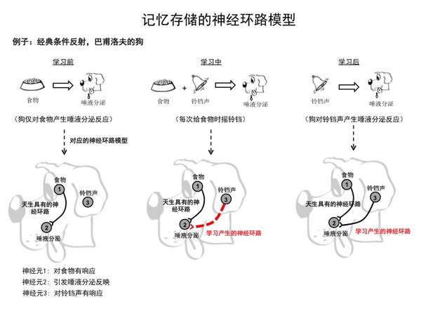 举一个最简单的记忆形当作的例子:巴甫洛夫的狗。尝试很是简单,原本狗只对食物发生反映(排泄唾液),进修中巴甫洛夫每次喂食时摇铃铛,于是最终狗一听到铃铛声也会感觉食物要来了,并排泄唾液。在这个简单的例子中,狗进行了进修而且在大脑中记住了铃铛声的特别意义——即将有食物了。那么狗的大脑是若何形当作这个记忆的呢?
