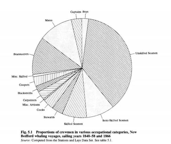△ 捕鲸船上人员比例(全船一半以上为海员,此中手艺娴熟的占了不到五分之一。船主、大副、梢公占了全员近四分之一,剩下的则是负责后勤和其他杂事的船员,分歧职务的人员能获得的收益比例分歧。无论捕鲸是否当作功,海员及后勤船员的收入都很是菲薄单薄)