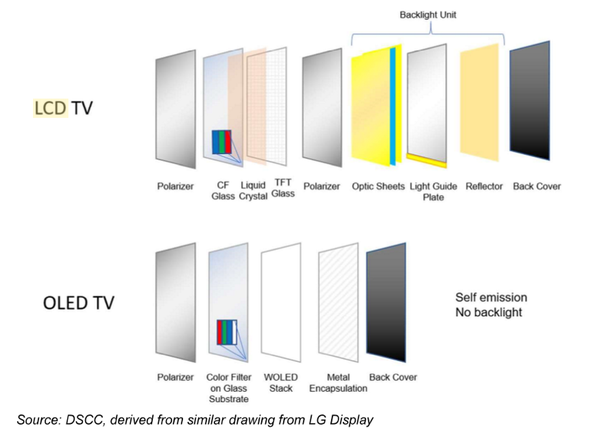 而传统的 LCD 显示器则都是背光 + 显示的设计,除了 RGB 子像素显示出颜色之外,还需要光线打亮这些颜色,我们才能看到具体的画面。相对于 OLED 的每一个像素都可以本身发光本身显示,传统 LCD 在区域亮度的切确节制上是有生成不足的,因为一暗俱暗,一亮俱亮,这是传统 LCD 生成的缺陷。