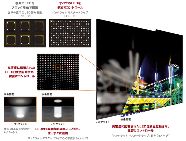 分区背光是什么,从字面意义就很好理解,LCD 的背光层不再由一整片背光实现,而是能像 OLED 一样自力节制,(再早一点的时辰还呈现过几个大区域自力控光的设计,但结果和一整片比拟,晋升不太高好比小米电视 4, 65 英寸版本就只有 10 个分区背光),上图就是索尼真 · 旗舰 Z9D 的 LED 背光层设计,足足拥有 800 多个自力 LED, 这些高密度的 LED 每一个都能自力开关,所以也就能按照显示层显示的画面进行自力背光,画面黑色区域对应的 LED 背光可以直接封闭,而画面亮色区域对应的 LED 背光就会以大亮度开启,这样就实现了超高的对比度。