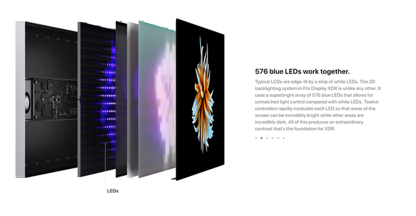 Pro Display XDR 采用了 576 个蓝光 LED 区域作为背光层,经由过程这些可以自力开关的小 LED, 实现了超高的亮度和切确节制的对比度,这就是峰值亮度 1600nit, 持续最大亮度 1000nit, 对比度 1,000,000:1 的道理。