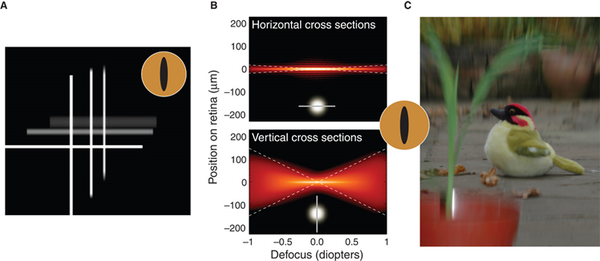 仍是上面的那个 Science Advances 的研究申明,横瞳可以或许改酿成像。而长方形的瞳孔对于当作像起到的感化是对像投射到视网膜上的外形发生影响。
