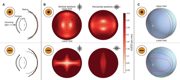 (A) Schematic sheep eyes viewed from above. The upper plot is for a circular pupil and the lower plot for a horizontally elongated pupil with the same area. The black curves represent, from left to right, the anterior and posterior surfaces of the cornea (radius 11.66 and 13 mm, thickness 0.8 mm, refractive index 1.382), the anterior and posterior surfaces of the lens (radius 9.17 and −8.12 mm, thickness 9 mm, refractive index 1.516), and the retina (radius 12 mm). The red and green dashed curves respectively represent the focal surfaces for vertical and horizontal contours. (B) Widths of sections through the point spread functions (PSF) for different pupils and retinal positions. The upper and lower plots were computed with circular (2.8 × 2.8 mm) and horizontally elongated (8 × 1 mm) pupils, respectively. The optic axis is in the center of each circular plot. Black concentric dashed circles represent different eccentricities. Colors correspond to the SD of the PSF (a measure of the spread of the PSF cross section) for vertical (left) and horizontal cross sections (right); lighter red corresponds to the smallest SD (that is, the sharpest image) and darker red corresponds to the largest SD (least sharp image). (C) Throughput for circular and horizontal pupils. The contour lines represent regions of constant throughput: red, blue, green, and yellow for 80, 60, 40, and 20%, respectively.