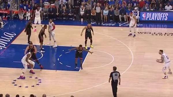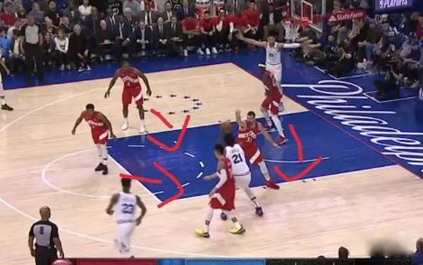 ——恩比德右侧腰位持球,西蒙斯在篮下,西亚卡姆也得以获得最好的协防位置,直接控住底线,而上线伦纳德洛瑞双锁连环。