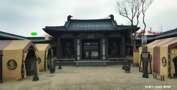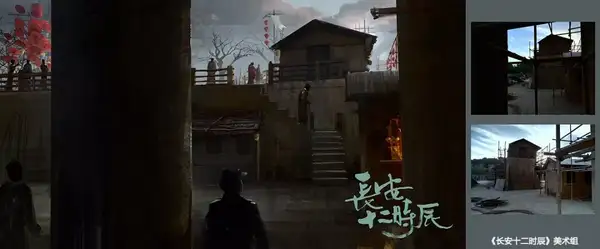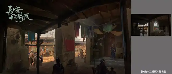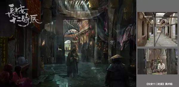 《长安十二时辰》(后文简称《长安》)剧组开机前期筹备一年,拍摄七个月,现实搭建占地 70 亩,坊门外的坊道 4 条,坊门 3 个,坊内 3 条本家儿街,13 条街巷,建造数目与建造精度令人叹为不雅止。
