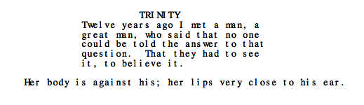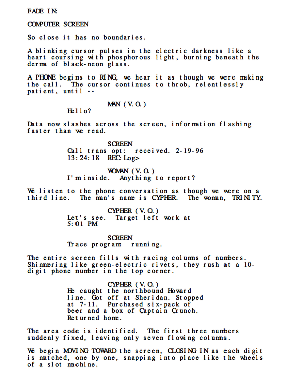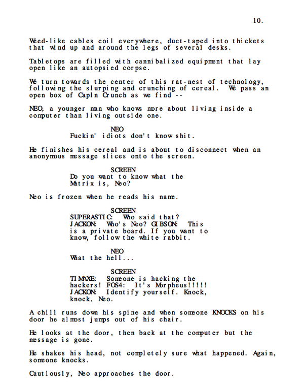 脚本里的第 10 页到 Neo 被敲门声吸引竣事,而影片的 10 分钟,已经进行到了后面,Neo 跟从电脑指引进入酒吧,并碰见了 Trinity。