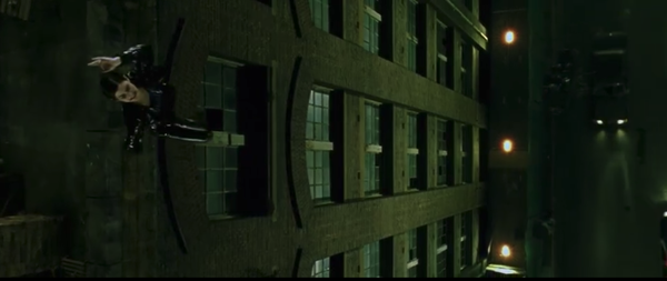 之后 Teaser 里是黑衣人追逐 Trinity, Trinity 违反物理纪律,横空跳过了大楼,进入德律风亭之后俄然消逝,表示这是个高概念科幻。