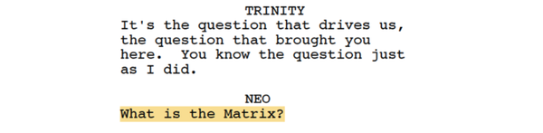 《黑客帝国》开场就能看到 Matrix,这没有泄底,它继续问的问题是”Is Neo the ONE?”