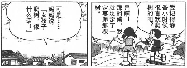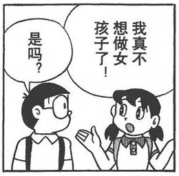 我可以很必定的说,藤子是有意要缔造这一矛盾的。若是说之前还不较着的话,那么《男女交换的故事》这一话则是完全显示了他的意图。这种矛盾,完全可以从静喷鼻身上放大到整个社会——这所谓的“淑女教育”是不是出了什么问题?同样是孩子,具有同样的本性,为什么女孩子爬树就不像话?为什么女孩子吃烤红薯就有损形象?藤子让我们看见静喷鼻这个“小淑女”的心里宿世界,也让我们看见那时社会对这些孩子本性的扼杀。