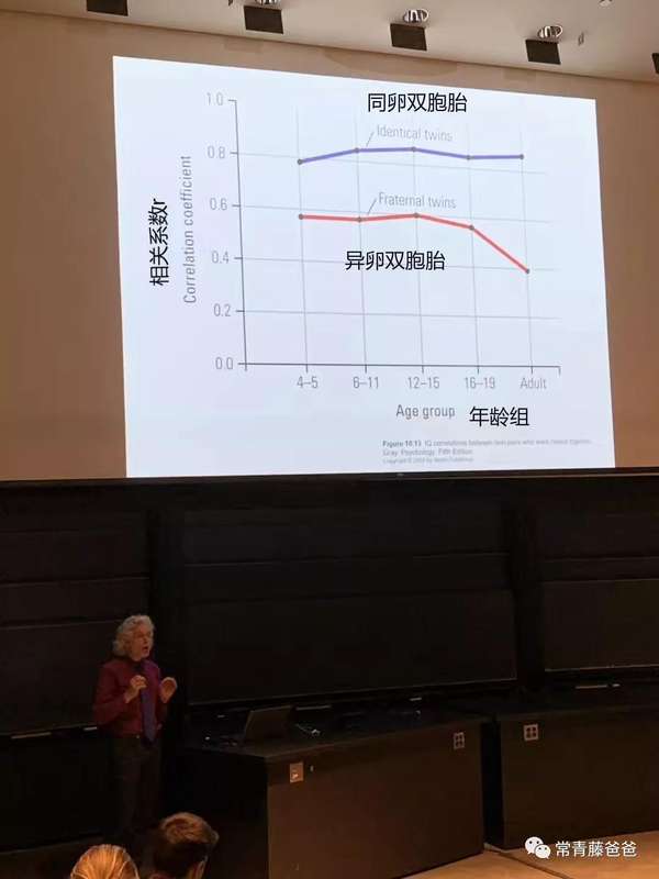 常爸在哈佛上课时,美国闻名尝试心理学家、认知科学家Steven Pinker传授就专门给我们分享了一张图表,就是关于基因对IQ的影响(图中表示为两曲线之间的距离)会跟着春秋的增加变大。
