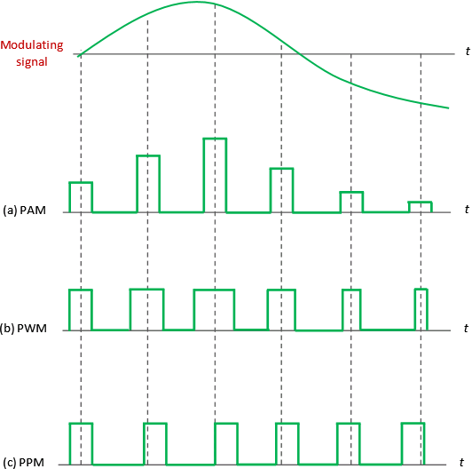 通俗的理解是这样的,我们凡是经由过程调节正弦波的频率、相位、幅度等参数来传输信息,并经由过程傅里叶变换等频域阐发体例来领受、解调这些信息,这里的「正弦波」我们称为「载波」。而传统 UWB 通信系统中,我们不需要「正弦载波」作为载体,而是直接发射电磁脉冲,经由过程调节脉冲的幅度(PAM,脉冲振幅调制)和脉冲的位置(PPM,脉冲位置调制)等体例来传递信息,如下图。