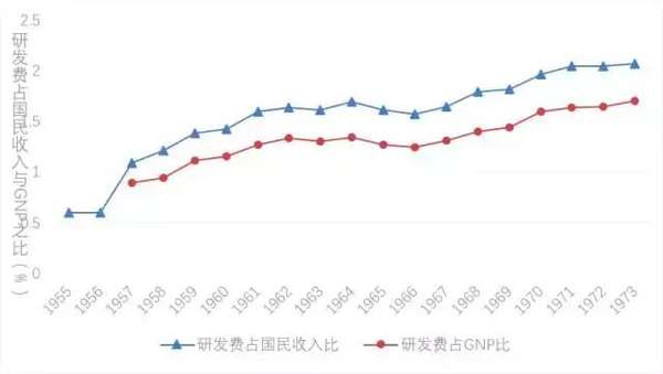 1960 年,日本在制订“国平易近收入倍增打算”的同时,还拟定了与此方针相呼应的“振兴科学手艺的综合根基政策”,提出要力争将国平易近收入的 2%用于科研。下图揭示了这一期间日本研发费投入占国平易近收入及国内出产总值之比的现实增加环境。该图显示,2%的数值方针进入七十年月后不久即告告竣,也就是说,日本上个宿世纪七十年月初的研发投入强度就接近达到了我国今天的水准。