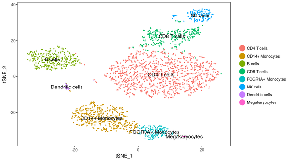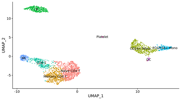 若是连系先验常识,查看每个类别对应细胞的差别表达基因,我们可以对每个类别进行注释,最终我们可以获得下面的这个成果: