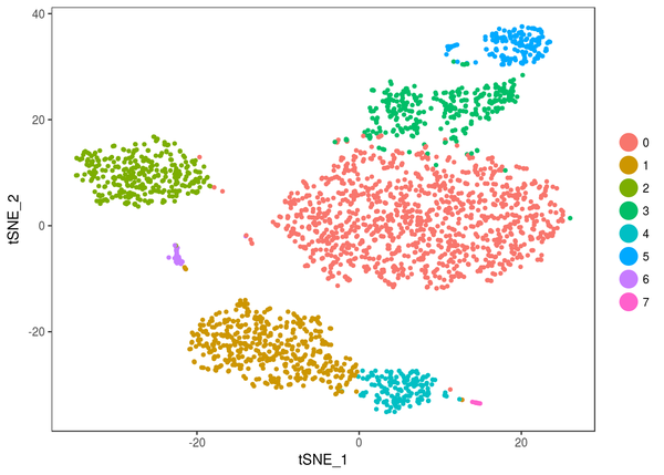 我们用非线性的降维方式 t-SNE,将这些细胞在二维的投影上分的更开,而且用 Louvain Algorithm,进行聚类 ,将聚类标签,用分歧颜色展示出来;