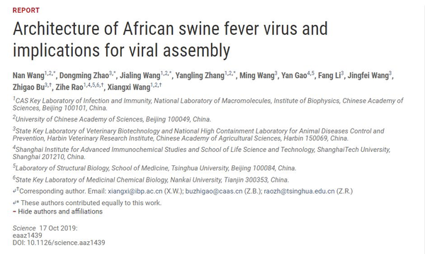 中国科学院生物物理研究所饶子和 / 王祥喜团队和哈尔滨兽医研究所步志高团队结合上海科技大学、清华大学、微生物所、武汉病毒所、南开大学等单元结合攻关研究,在不到 1 年的时候里解析了非洲猪瘟病毒邃密布局,为开辟结果佳、平安性高的新型疫苗奠基了坚实根本。10 月 18 日凌晨(海说神聊京时候),相关论文在《Science》上颁发。