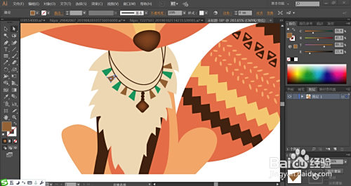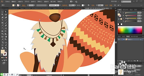 最后,我们用桔红色填充狐狸的大从头至尾巴,再用暗棕色、黄色搭配填充从头至尾巴上面的图案,利用网格东西点击从头至尾巴的顶端让其呈现暗棕色的渐变结果,完当作狐狸图案设计。