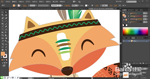 利用桔黄色、淡桔红色、桔红色搭配填充狐狸的脑壳,再用暗棕色填充狐狸的鼻头,再用暗棕色填充狐狸的耳朵内部。狐狸的头部用黑色与绿色搭配填充发带的路径。