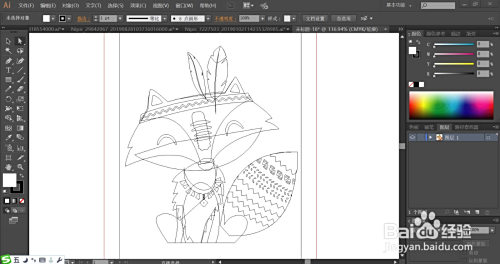 利用钢笔画出狐狸的面部脸色,再画出它的头上的羽毛的细节,还怀孕体坐立的动作,胸前的项链,死后的大从头至尾巴以及上面的图案路径。