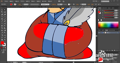 最后,巨匠的长袍用红色与红棕色搭配填充,衣服双方为暗光区域用红棕色填充,中心是亮光区域用蓝色填充,完当作巨匠侠客漫画设计。