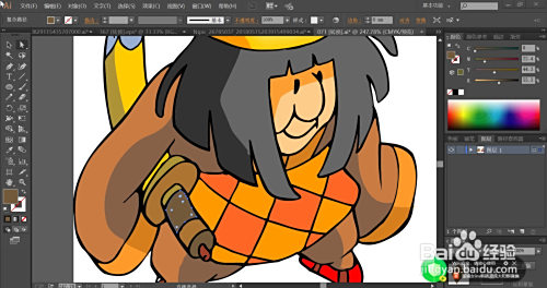 侠客的服饰用黄褐色与灰棕色搭配填充袖口,再用桔黄色与桔红色搭配填充胸前的方块路径。