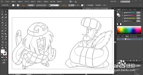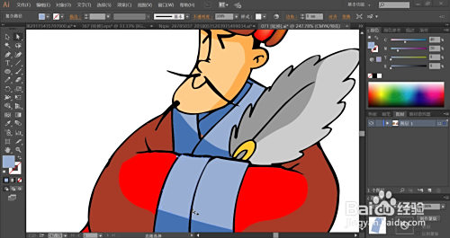 利用钢笔画出侠客的面部的特征,再画出他的大刀与刀鞘,画出侠客的服饰细节,接着,我们再画出大量的安静脸色,还有巨匠的帽子与服饰的色彩细节路径。