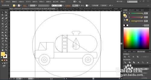 接着,我们用矩形东西来画一画油车的大油罐,再画出车厢,利用圆形画出车轮,利用钢笔画出车头的细节路径。
