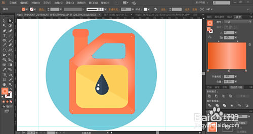 接着,我们设置桔红色的渐变填充油桶的整体路径,油桶的正面用网格东西点击一下让其呈现桔黄色的渐变结果。接着,我们用明暗两种蓝黑色填充油桶正面的油滴,再用白色填充油滴的左侧高光,完当作油桶图标设计。