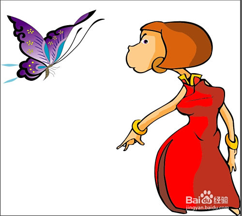 利用钢笔画出翱翔的蝴蝶,本家儿要绘制蝴蝶同党上面的圆点与曲线的图案,再画出蝴蝶的身体与触角的细节,接着,我们画出女人的脸色与服饰,她回身的动作细节路径。